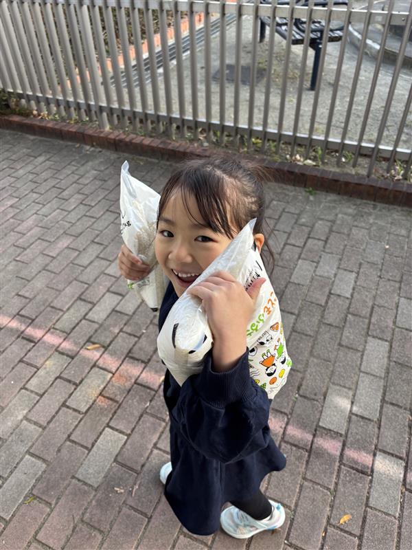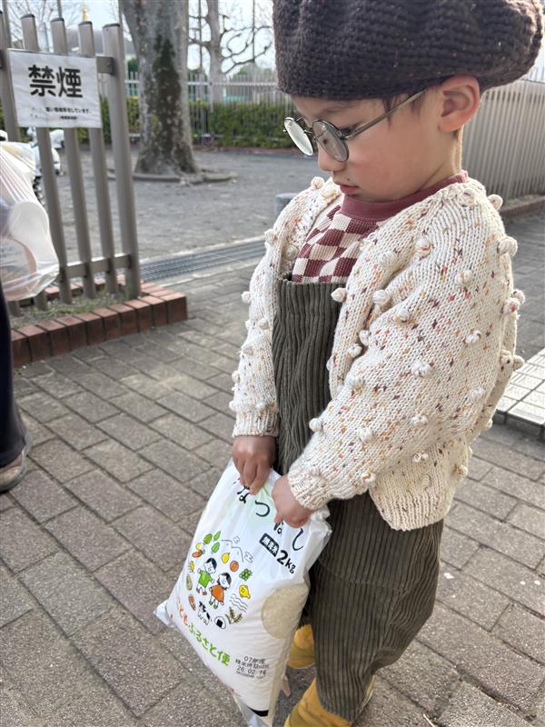 お米を受け取った子どもたちは 「お米だいすき〜」と元気に声をあげたり、 「これ僕の!」と大事に抱きかかえたり、 重くても一生懸命、自分で運ぼうとしたり。